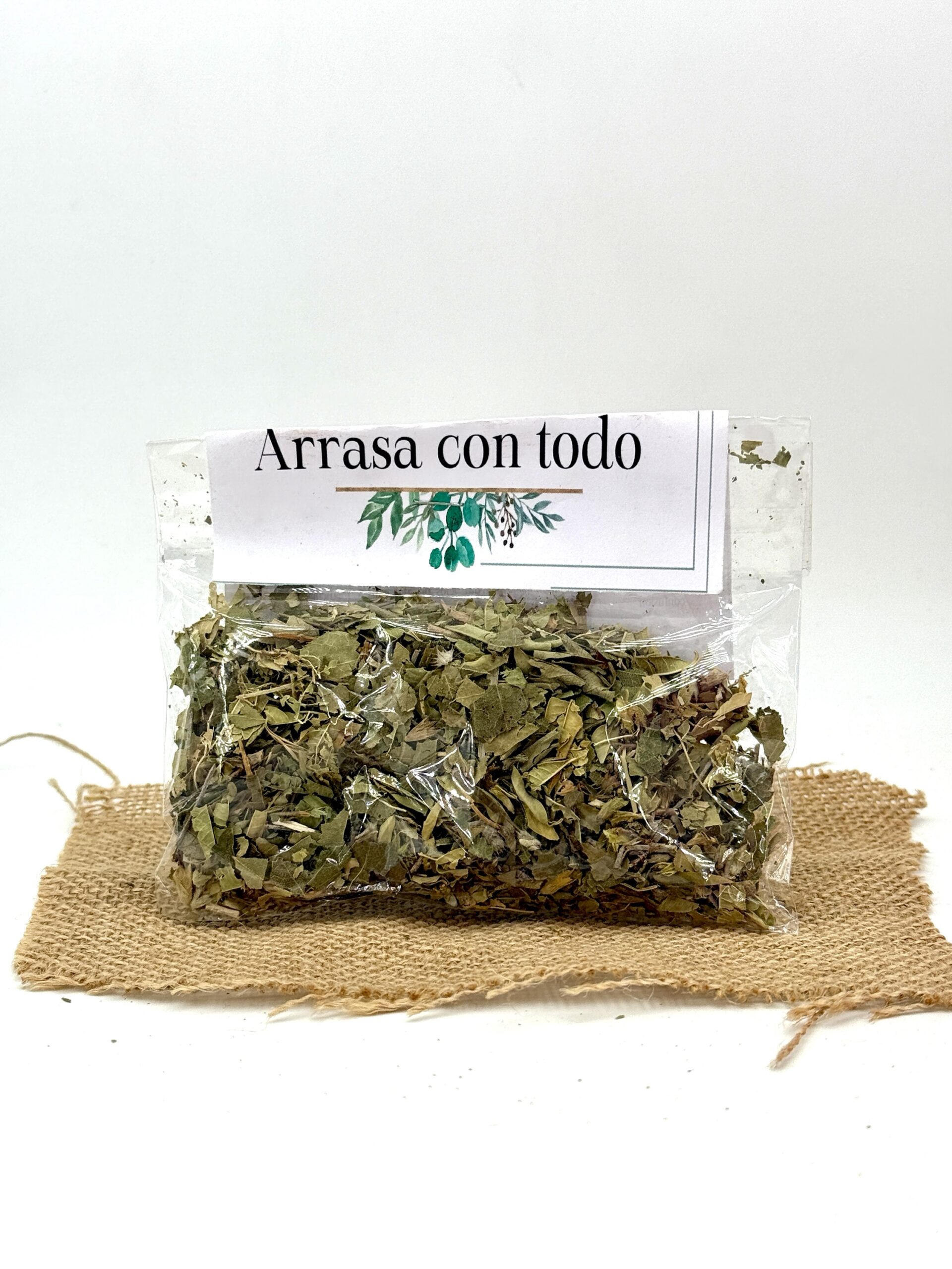 La hierba Arrasa con Todo es conocida por su poderosa energía para eliminar todo tipo de obstáculos, negatividades y trabas espirituales. Es una planta de corte fuerte que ayuda a limpiar profundamente el aura, el hogar y el entorno, dejando el camino libre para el éxito y la prosperidad.