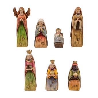 Un hermoso pesebre artesanal de madera tallada y pintada a mano, compuesto por 7 figuras de 16 cm de altura.