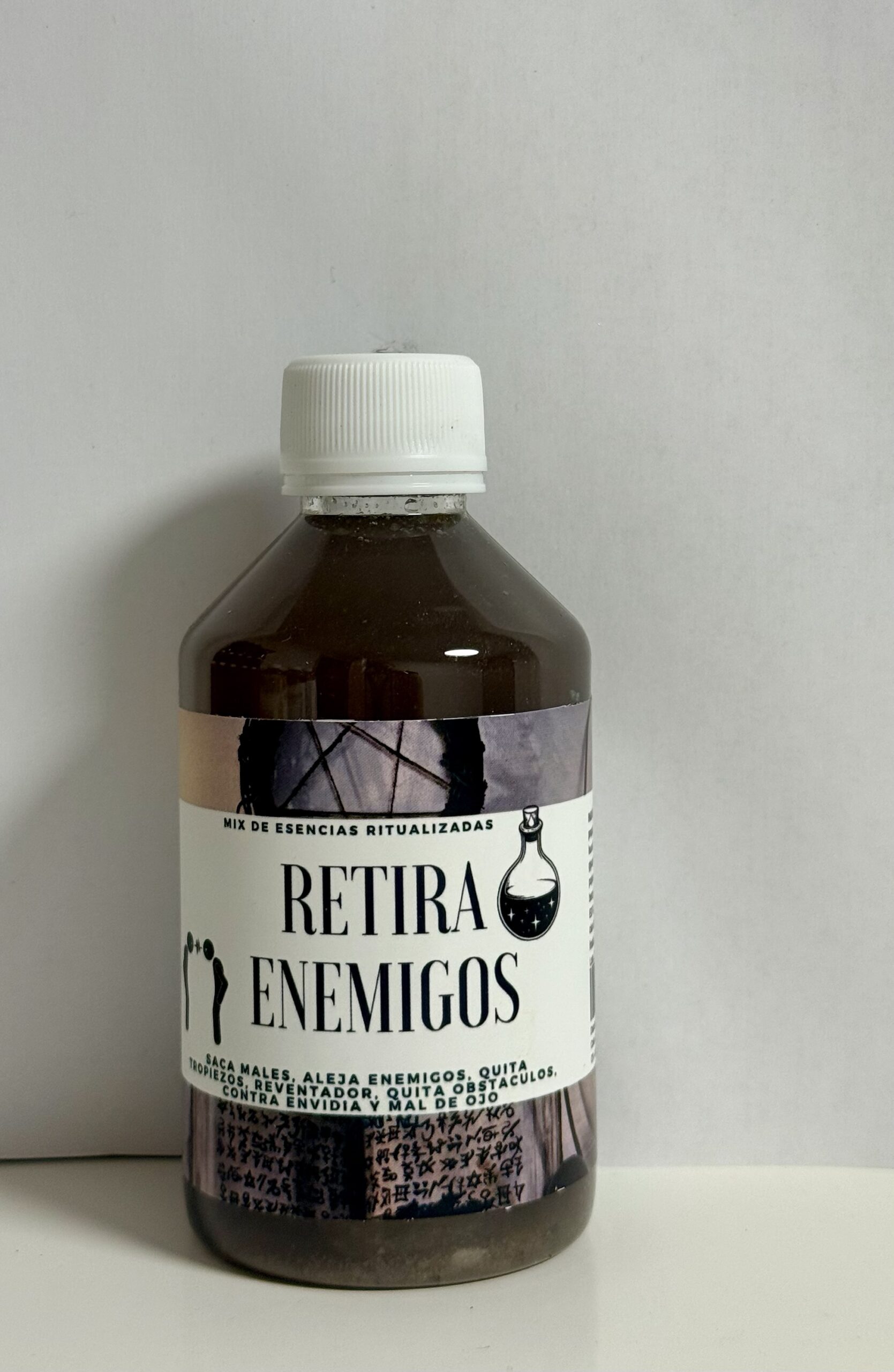 La Esencia Retira Enemigos es un preparado esotérico elaborado con extractos botánicos, esencias naturales y componentes ritualizados, cuyo propósito es alejar a personas negativas, envidiosas o malintencionadas del entorno del usuario. Su fragancia intensa y su vibración energética actúan como un escudo espiritual, cortando influencias dañinas.