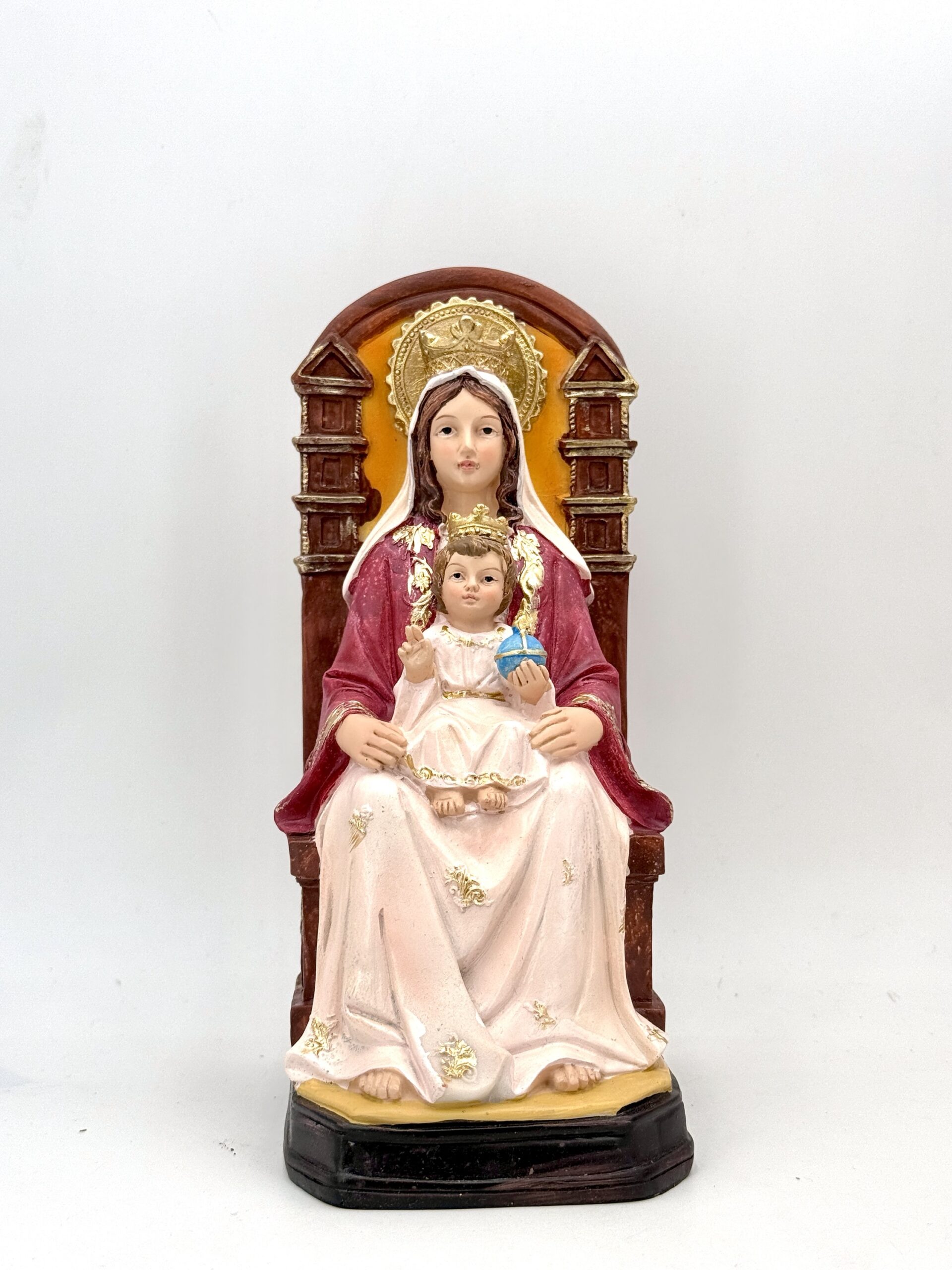 Se representa con corona, túnica real y el Niño Jesús en brazos, irradiando luz y esperanza.