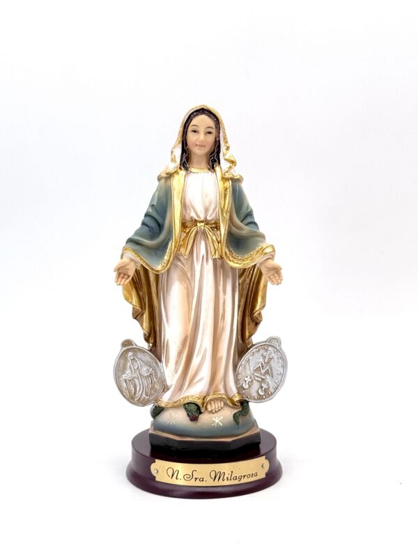Se representa de pie sobre un globo, aplastando una serpiente (símbolo del mal), con los brazos extendidos y rayos de luz que salen de sus manos, símbolo de las gracias divinas.